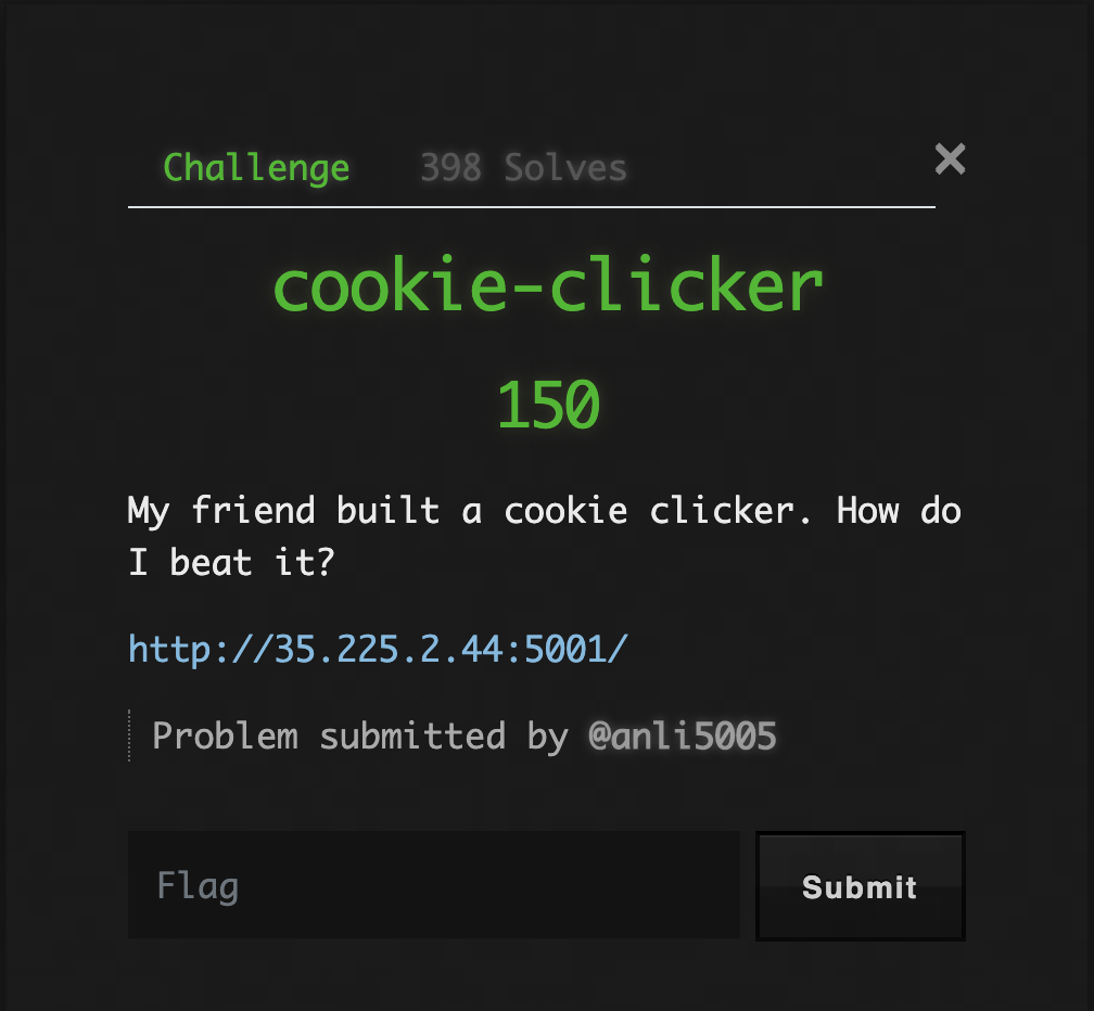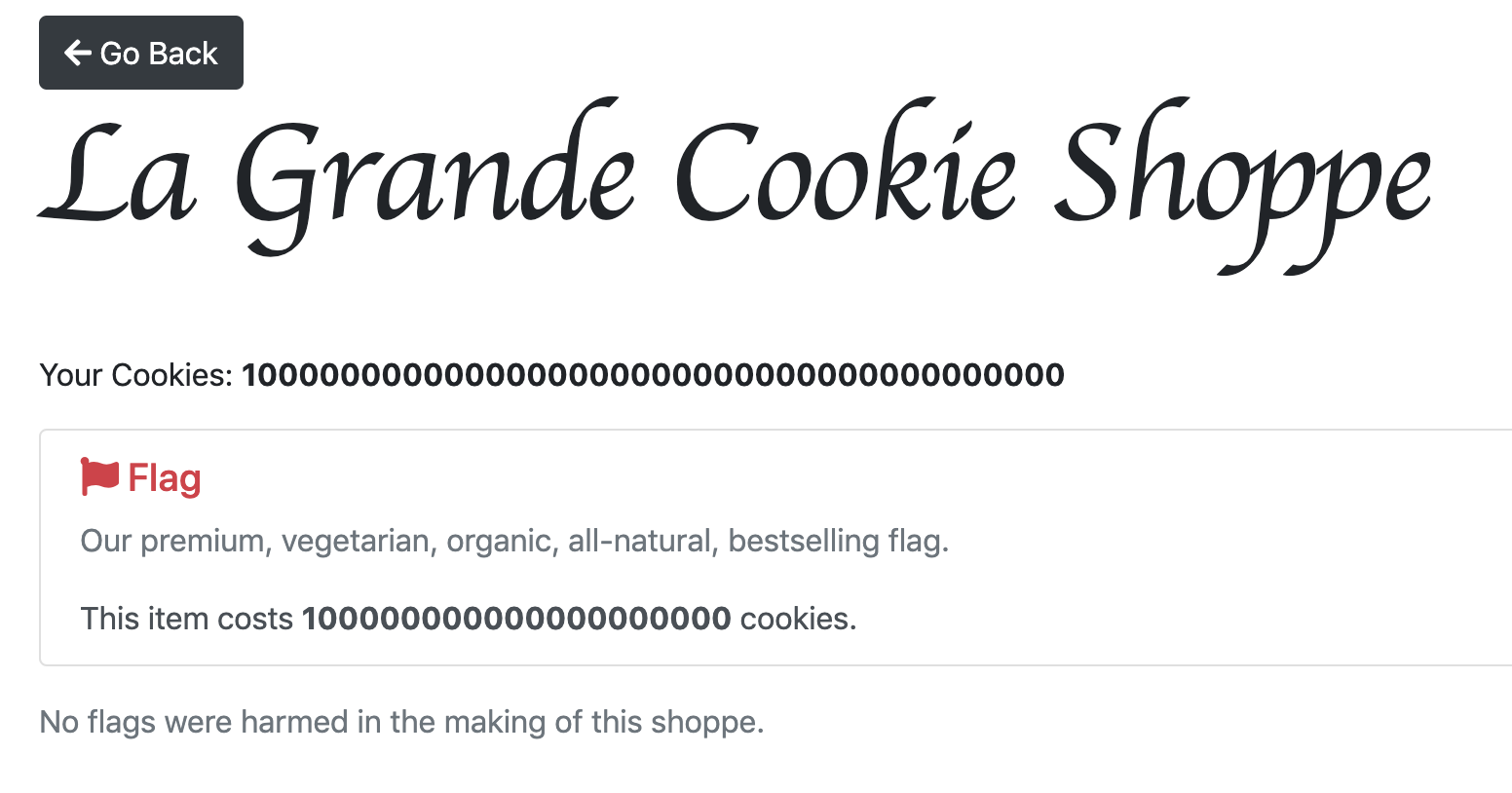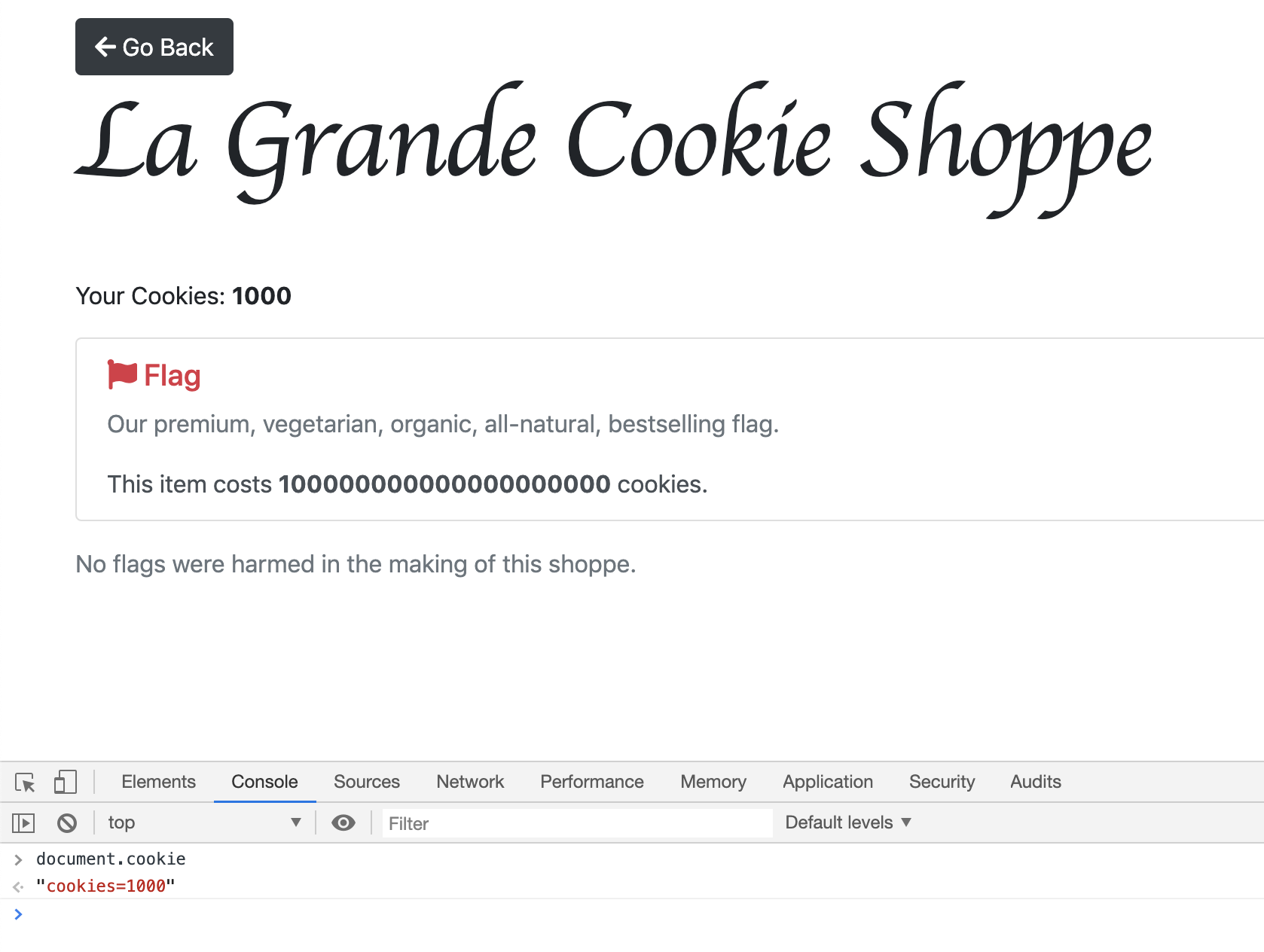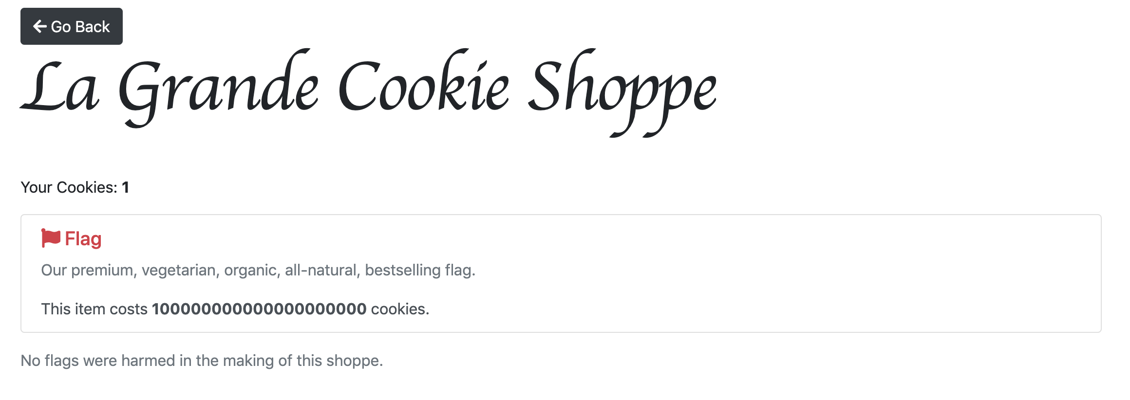 That brings us to a shopping portal that displays our cookie count from the previous page.